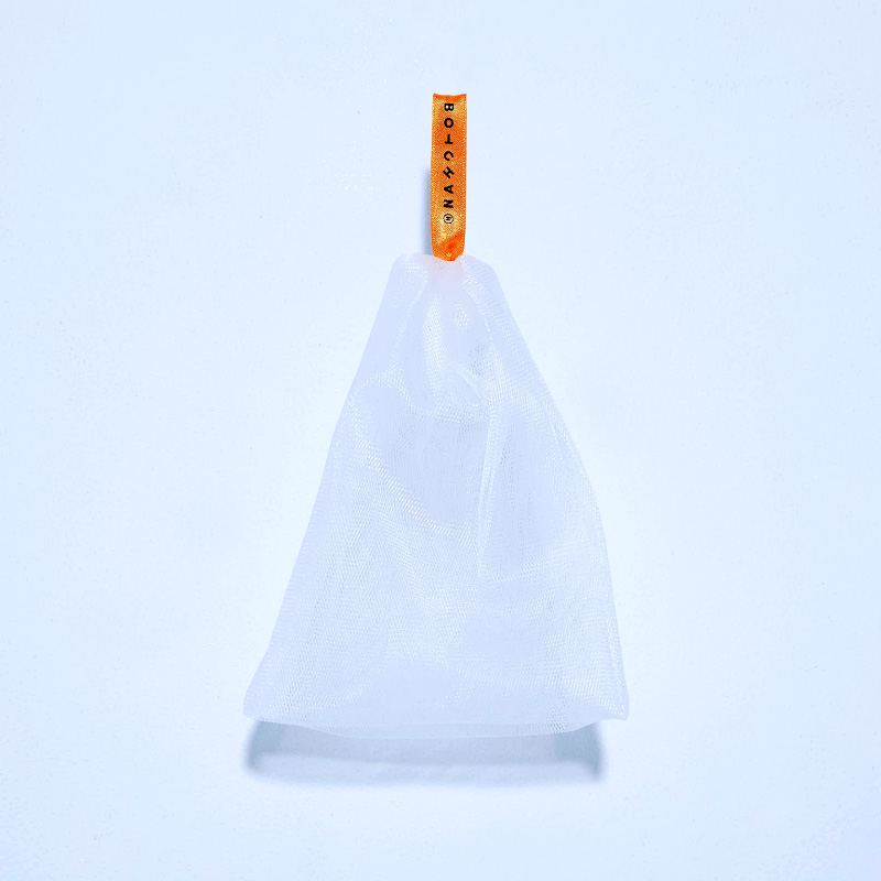 ネットをこすり合わせ、空気を含ませながら泡立てます。