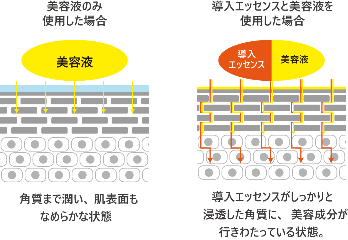導入エッセンスで潤いを受け入れ準備が整った肌は、美容液がなじみやすく、角質層のすみずみまで美容成分が行き渡ります。