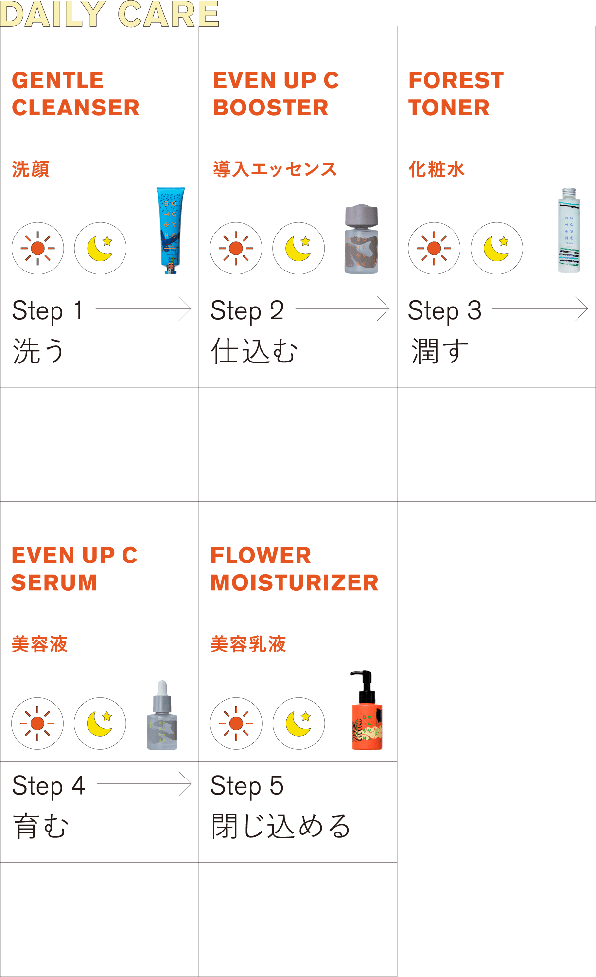 BOTCHAN のフォレストトナー(化粧水)とフラワーモイスチャライザー(乳液)に配合されている成分との相性も良く、相乗効果を感じていただくには、BOTCHAN のスキンケア製品とのライン使いが、よりおすすめです。